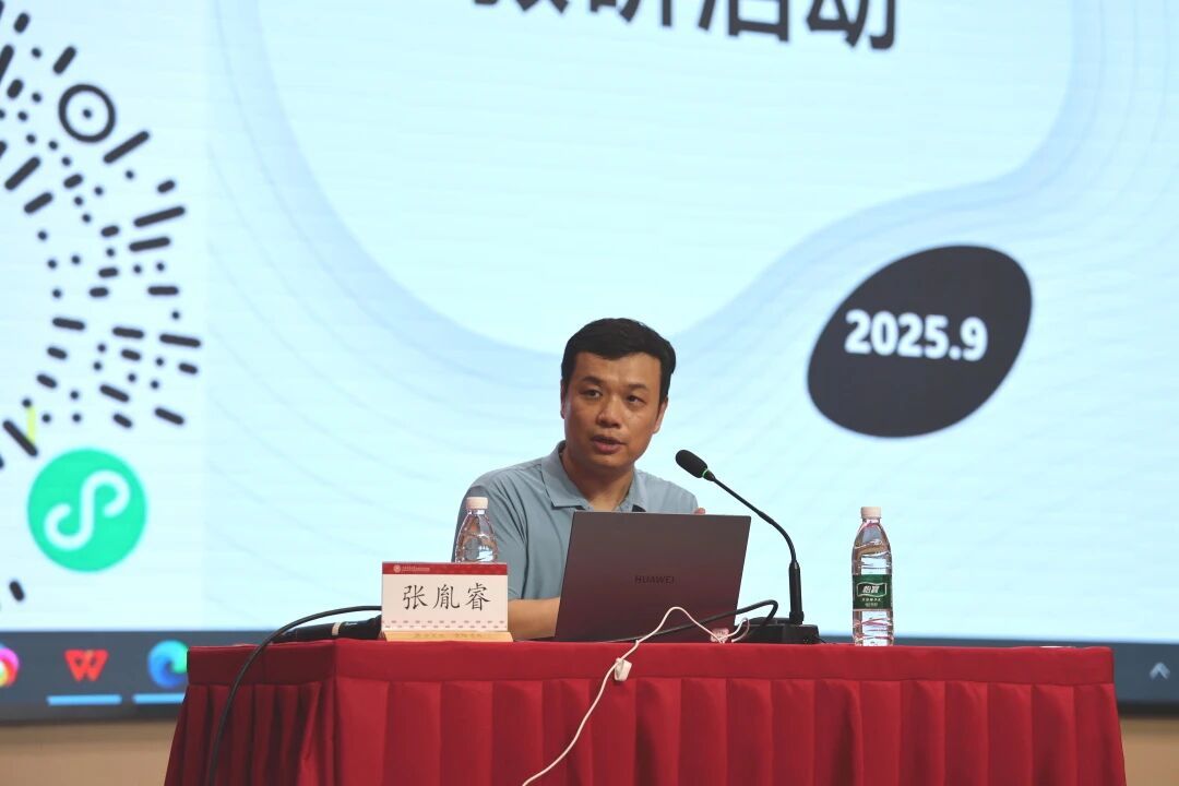闵行区初中数学教研员张胤睿主持核心教研环节,他以 “回顾过往、立足当下、展望未来” 为脉络,先简要介绍了 2025 年闵行区初中数学教师队伍建设的推进情况与教研活动的整体开展态势,随后从三大板块深入解读,为新学年教研工作锚定方向: