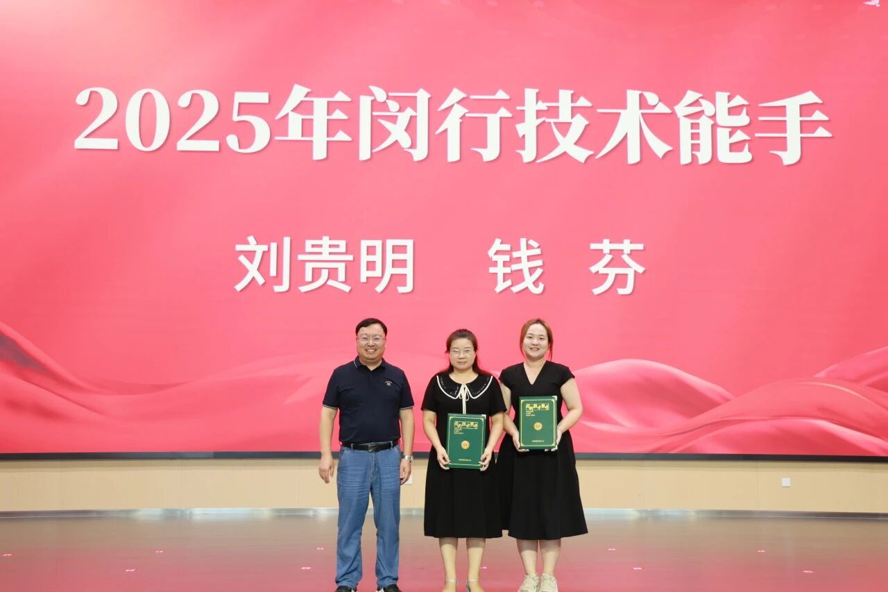 朱诵玉为荣获“2025年闵行技术能手”称号的教师刘贵明、钱芬颁奖。