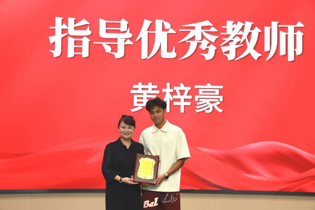 冯志兰为荣获2025年上海市闵行区中小学生跆拳道比赛“指导优秀教师”称号的教师黄梓豪颁奖。