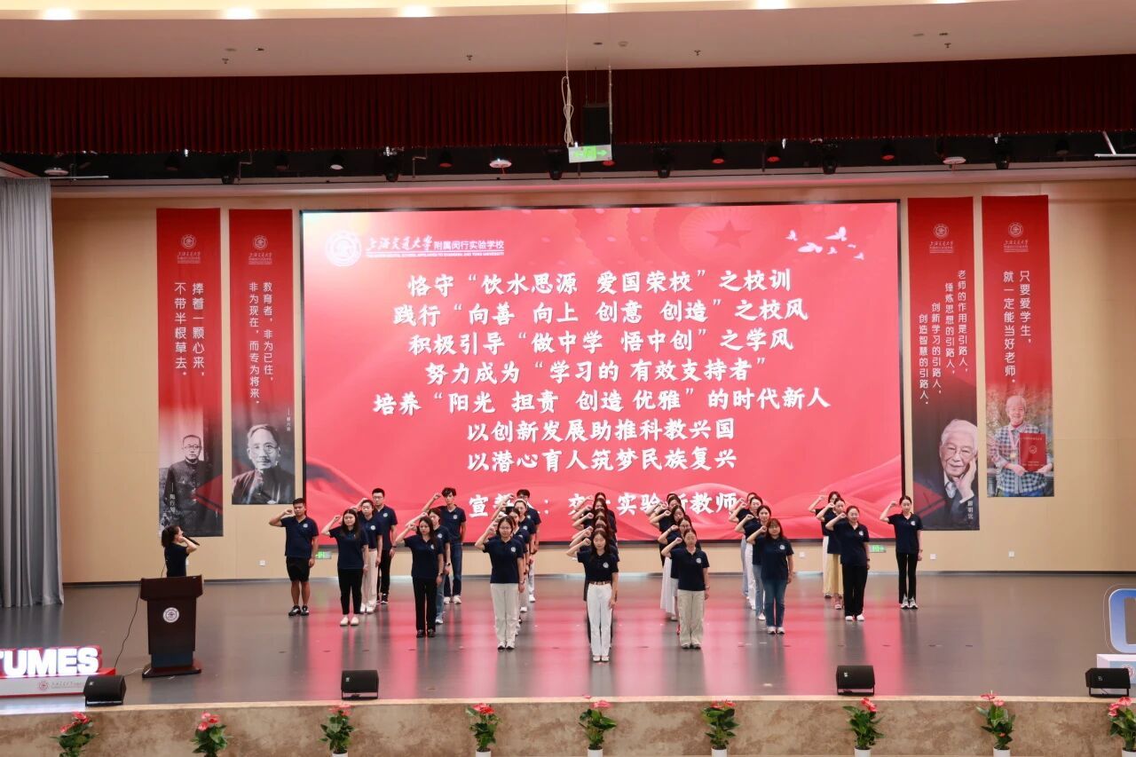 教师发展中心副主任蔡莉琴带领应届新教师庄严宣誓。铿锵誓言饱含对教育事业的忠诚与情怀,彰显了交大实验青年教师的责任担当与精神面貌。