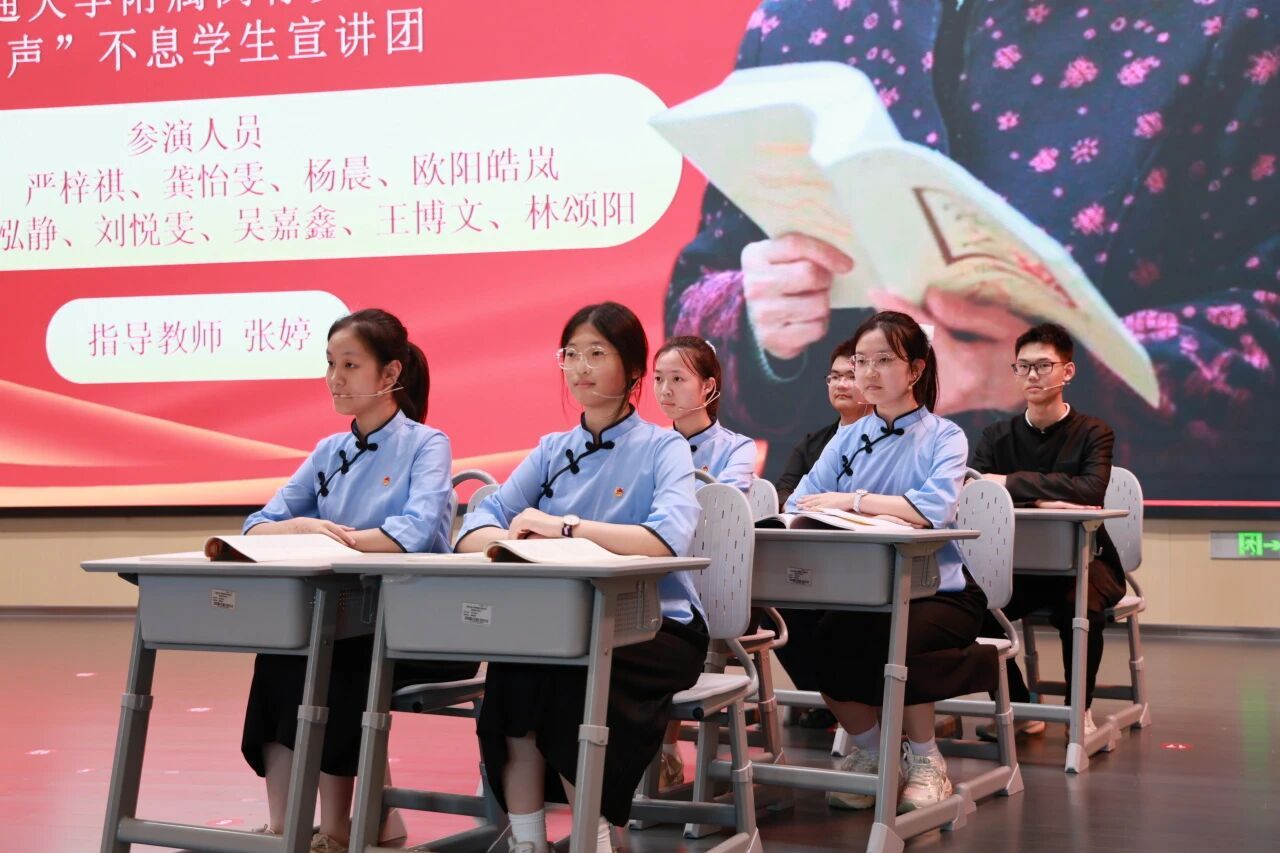 交大实验生“声”不息学生宣讲团进行节目展演。高中生们重现人民教育家于漪老师经典课例《海燕》,鲜活呈现了“目中有人”的教育理念,展现了教育传承的独特魅力。