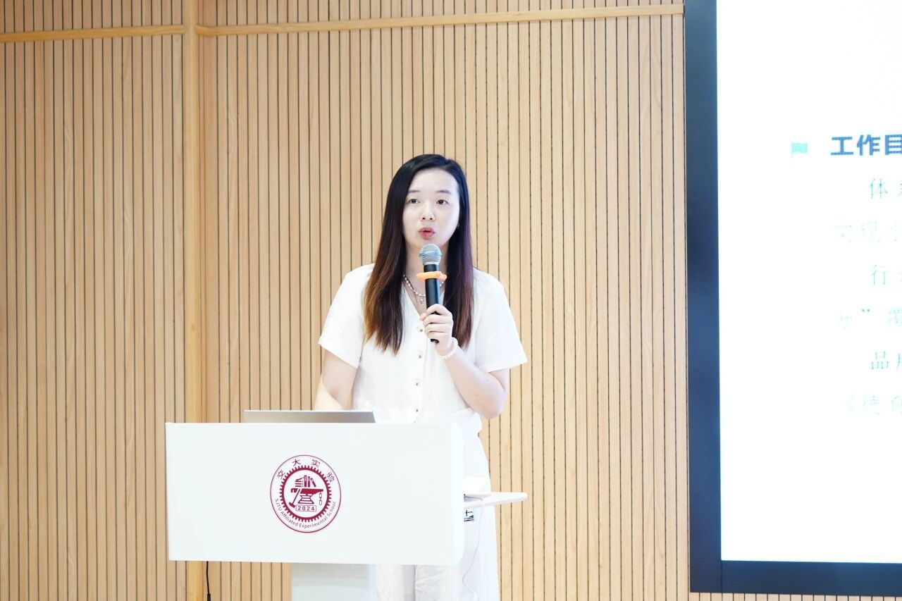 学生发展中心丁冰洁老师以“聚焦品格养成,深化协同育人,赋能师生成长”为主题,展开新学期德育工作部署。她着重指出,要将交大“饮水思源”的精神内核,与学校“科工通融、人文浸润”的办学特色深度融合,构建K12一体化德育体系。明确将体系化、行为化、品牌化作为核心工作目标:通过“课程育德”渗透德育理念,依托“活动育人”丰富德育实践,借助“评价激励”强化德育效果。丁老师阐述了新学期学校德育工作的整体规划与学期重点工作,并对各部门职责、工作内容及细则要求进行详细介绍,为全员德育工作落地见效提供清晰指引。