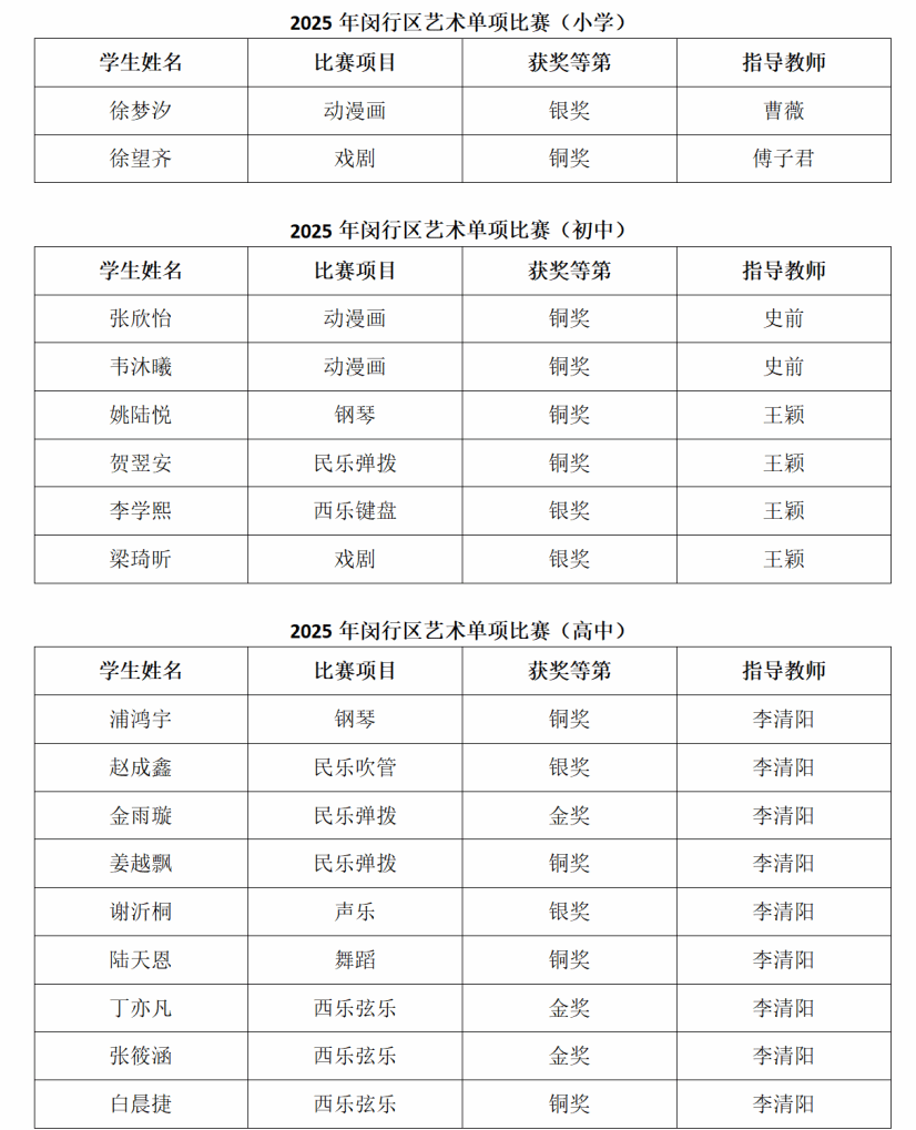 此外,2025年闵行区艺术单项比赛在各项类别中,我校共摘得3枚金奖、5枚银奖、9枚铜奖!